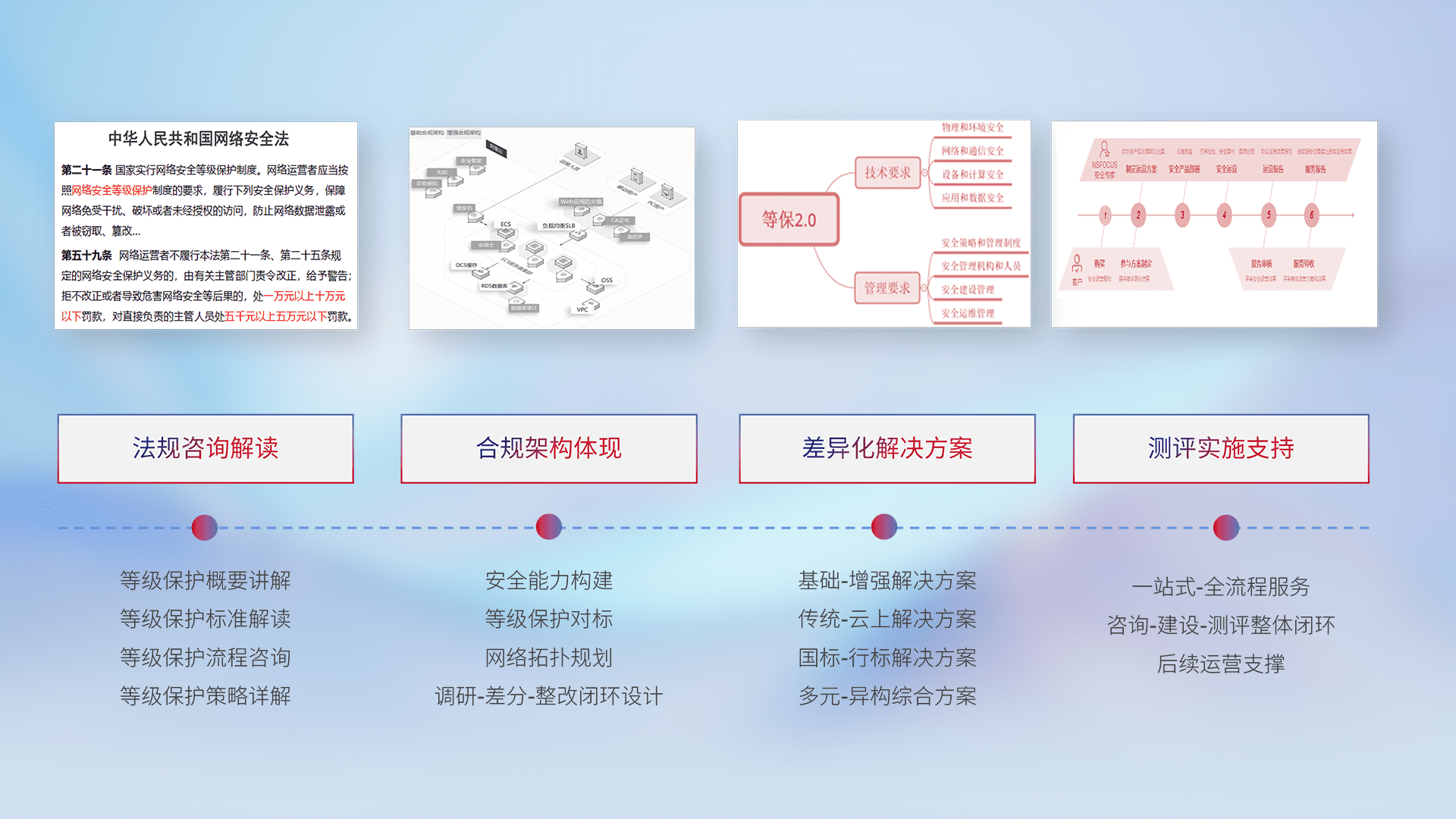 通过专业的法律咨询解读、、合规架构体现、、差异化解决方案、、、、测试实施支持等服务,,,为客户量身打造等保合规体系。。。。